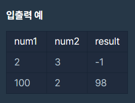 정수 num1과 num2가 주어질 때, num1에서 num2를 뺀 값을 return하도록 soltuion 함수를 완성해주세요.