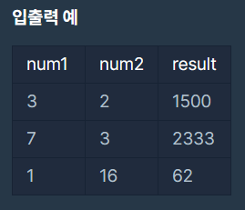 정수 num1과 num2가 매개변수로 주어질 때, num1을 num2로 나눈 값에 1,000을 곱한 후 정수 부분을 return 하도록 soltuion 함수를 완성해주세요.