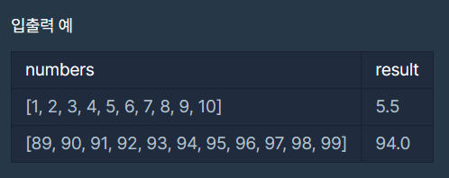 정수 배열 numbers가 매개변수로 주어집니다. numbers의 원소의 평균값을 return하도록 solution 함수를 완성해주세요.