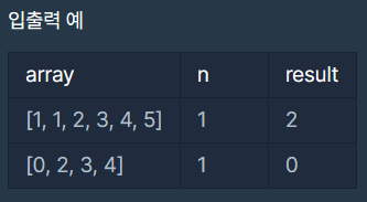 정수가 담긴 배열 array와 정수 n이 매개변수로 주어질 때, array에 n이 몇 개 있는 지를 return 하도록 solution 함수를 완성해보세요.