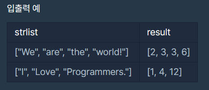 문자열 배열 strlist가 매개변수로 주어집니다. strlist 각 원소의 길이를 담은 배열을 retrun하도록 solution 함수를 완성해주세요.