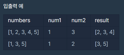 정수 배열 numbers와 정수 num1, num2가 매개변수로 주어질 때, numbers의 num1번 째 인덱스부터 num2번째 인덱스까지 자른 정수 배열을 return 하도록 solution 함수를 완성해보세요.