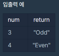정수 num이 짝수일 경우 "Even"을 반환하고 홀수인 경우 "Odd"를 반환하는 함수, solution을 완성해주세요.