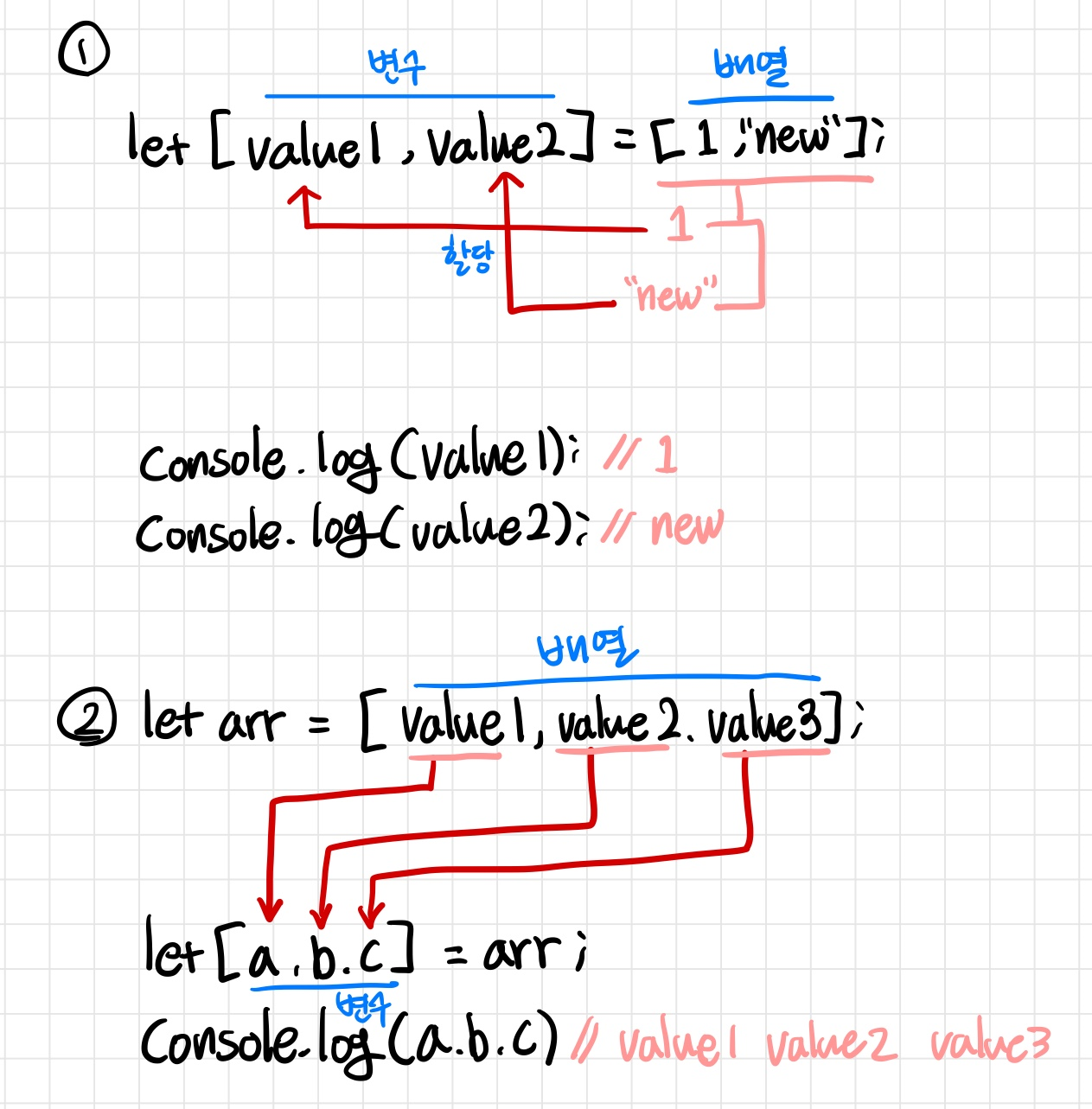 배열이나 객체의 속성을 분해해서 그 값을 변수에 담을 수 있게함