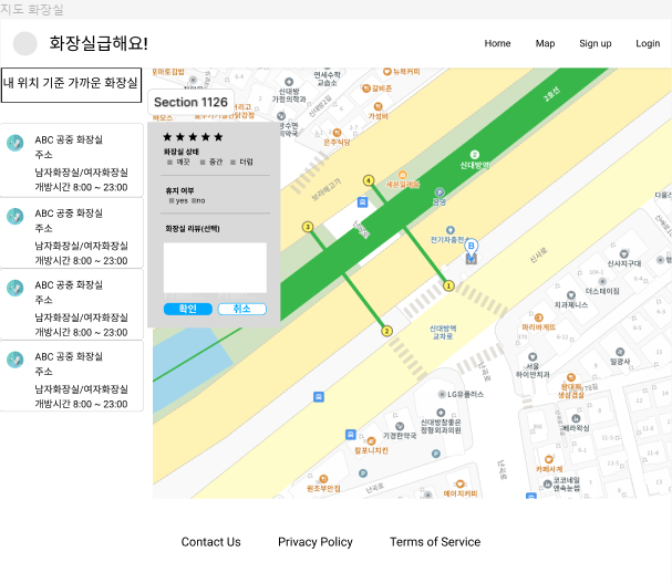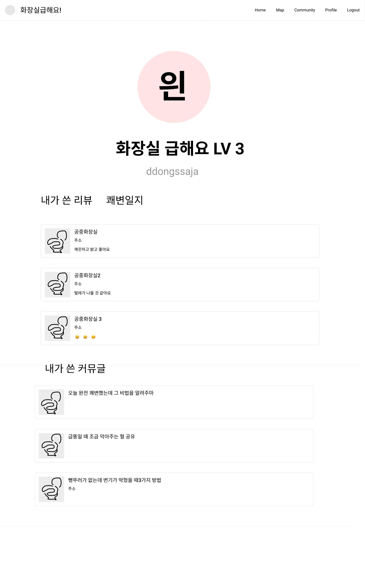 - 갑자기 화장실이 급한 적이 많았던 우리가 필요해서 우리가 만드는 웹페이지로, 화장실과 더불어 휴지를 구매할 수 있는 가까운 편의점까지 표시하였다.