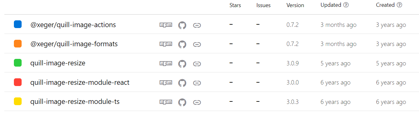 각 라이브러리별 생성날짜와 업데이트날짜를 보면 @xeger/quill-image-formats/actions 가 가장 최근까지 업데이트 된 것을 확인할 수 있다.