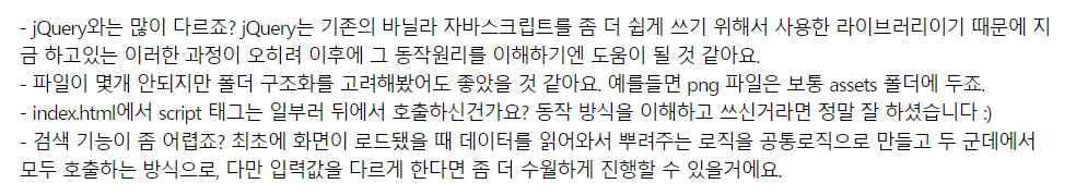 피드백에서 해주신 말씀대로 웹개발 강의에서 마냥 훔쳐온 것 같은 jquery 내용과 달리 바닐라로 하니까 동작 하나한 의미를 짚어보기 좋았던 것 같다.