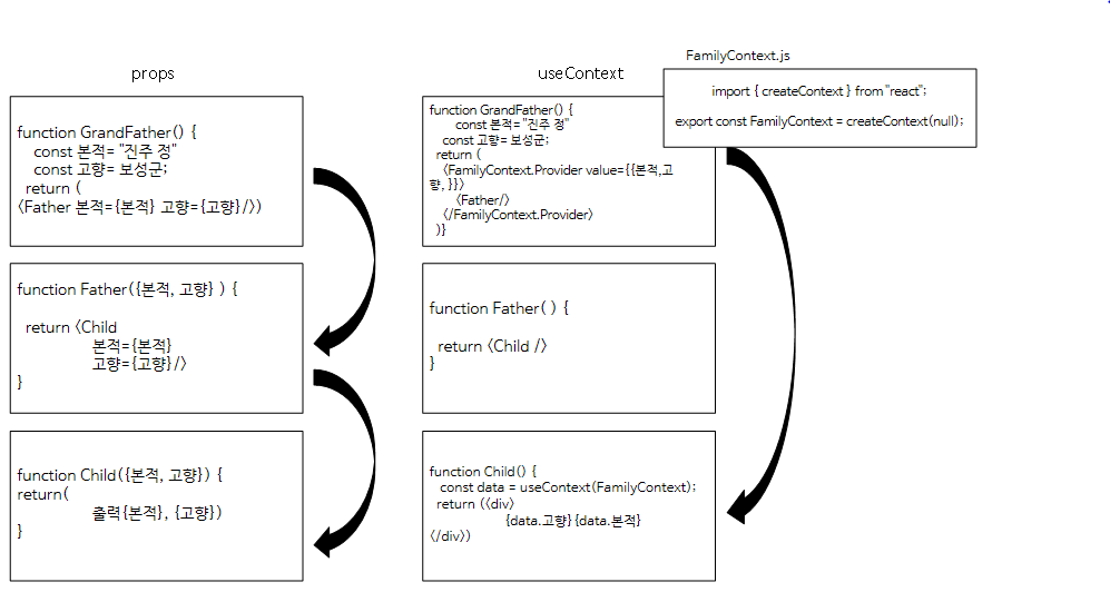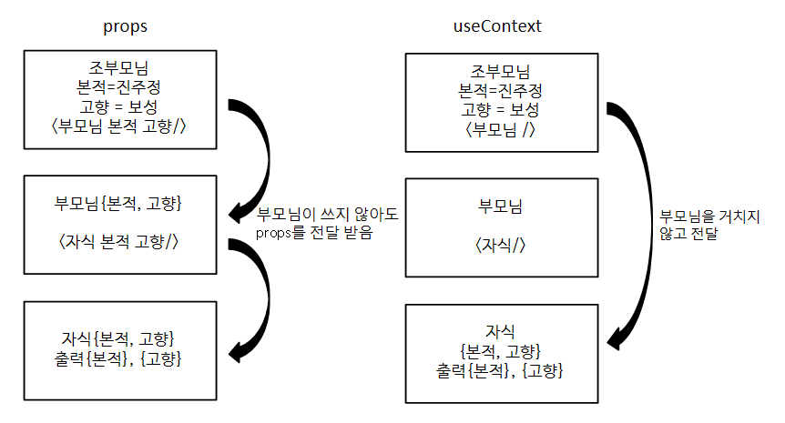 일반적을 데이터를 넘겨줄 때 부모에서 자식컴포넘트로 props를 통해서 데이터를 내려주곤 했는데 이게 너무 많이 되면 props drilling이 일어난다고 했었다.