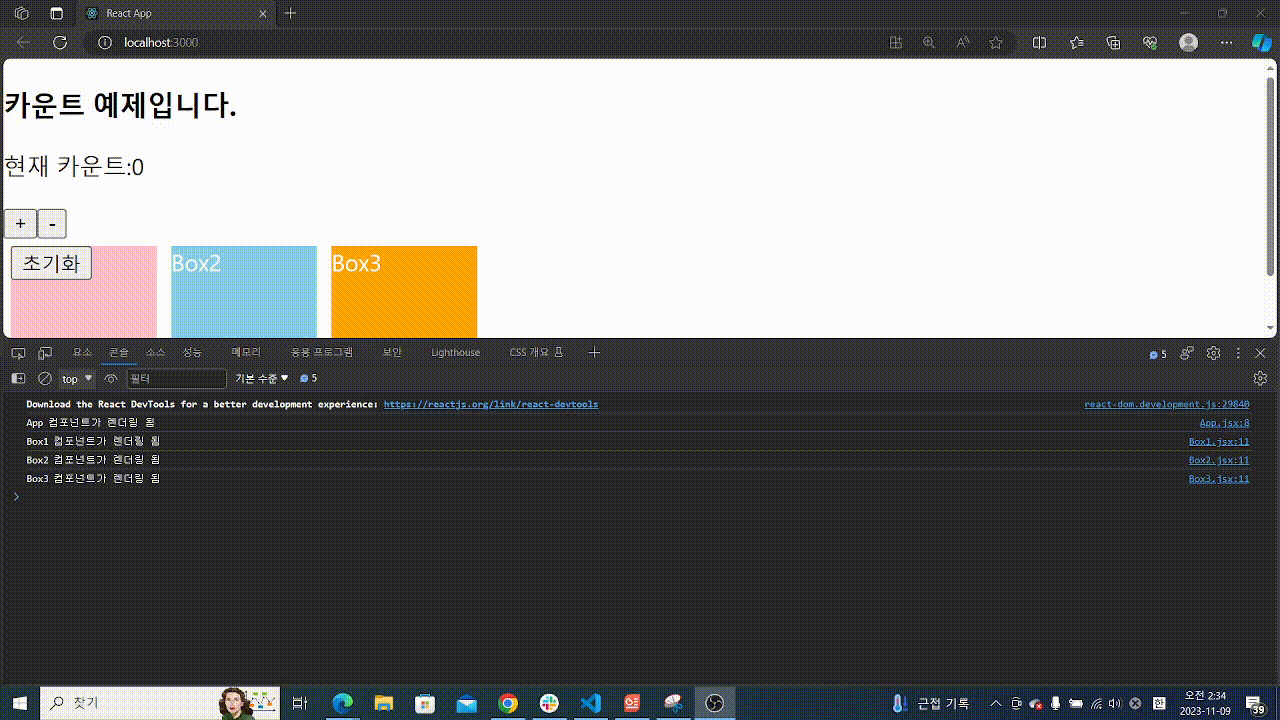 원래라면 box3까지 렌덜이이 되야하지만 memo기능을 이용해서 App컴포넌트만 렌더링 되게 했다 컴포넌트를 메모리제이션하는 것이다.