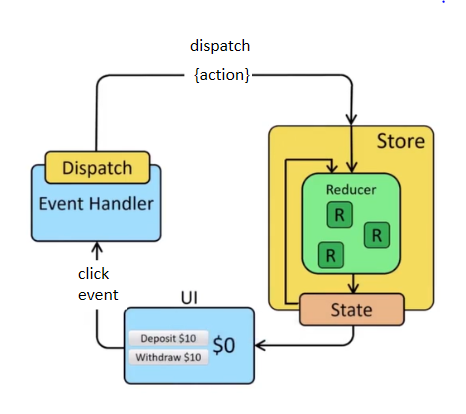 UI에서 클릭이벤트를 주면 eventhandle에서 dispatch가 action객체를 들고 store에 전달해주면 reducer가 새로운 state를 내보내 리렌더링된다.