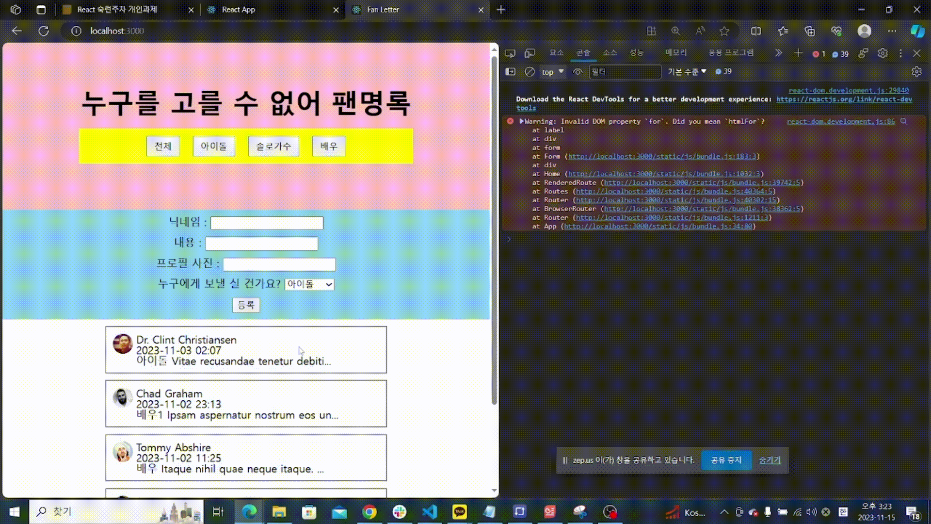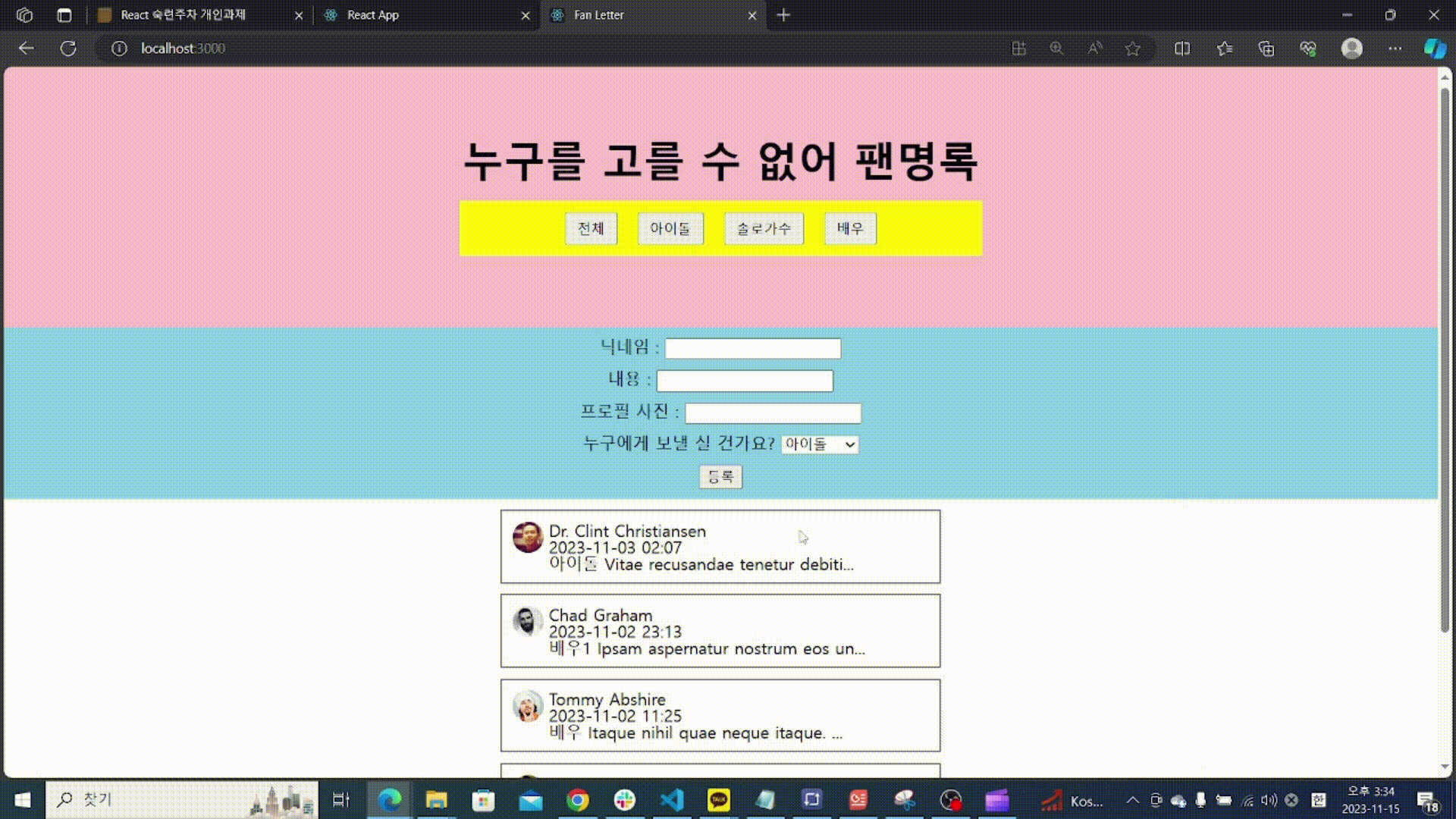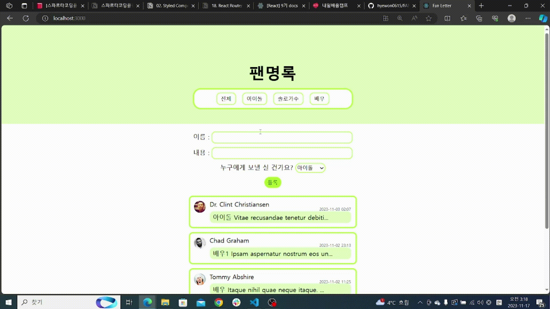| 20231113 TIL Fan Letter -2 편지추가하기 , 분류버튼, 상세페이지 만들기, router로 연결하기 (1) | 2023.11.14 |