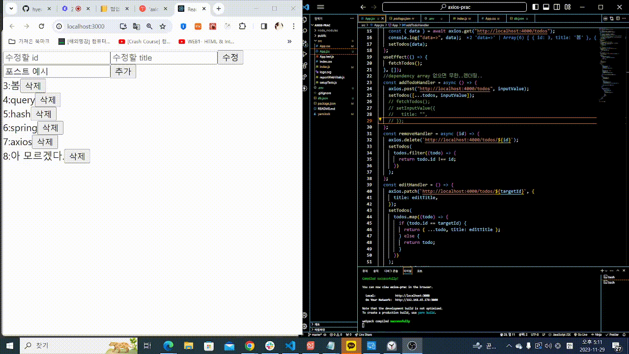 수정과 삭제는 둘다 해당하는 id에 맞는 글만 적용이 되어야하기 때문에 server url 뒤에 아이디를 특정할 수 있는 것을 넣어주어야한다.