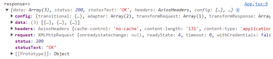 json-server로 만들어 놓은 데이터를 get 해오는데 response로 그대로 받아서 콘솔에 찍어보면