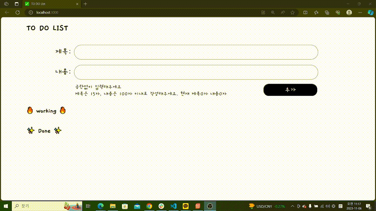 제목과 내용을 입력하고, [추가하기] 버튼을 클릭하면 Working에 새로운 Todo가 추가되고 제목 input과 내용 input은 다시 빈 값으로 바뀌도록 구성해주세요.- Todo의 isDone 상태가 true이면, 상태 버튼의 라벨을 취소, isDone이 false 이면 라벨을 완료 로 조건부 렌더링 해주세요.